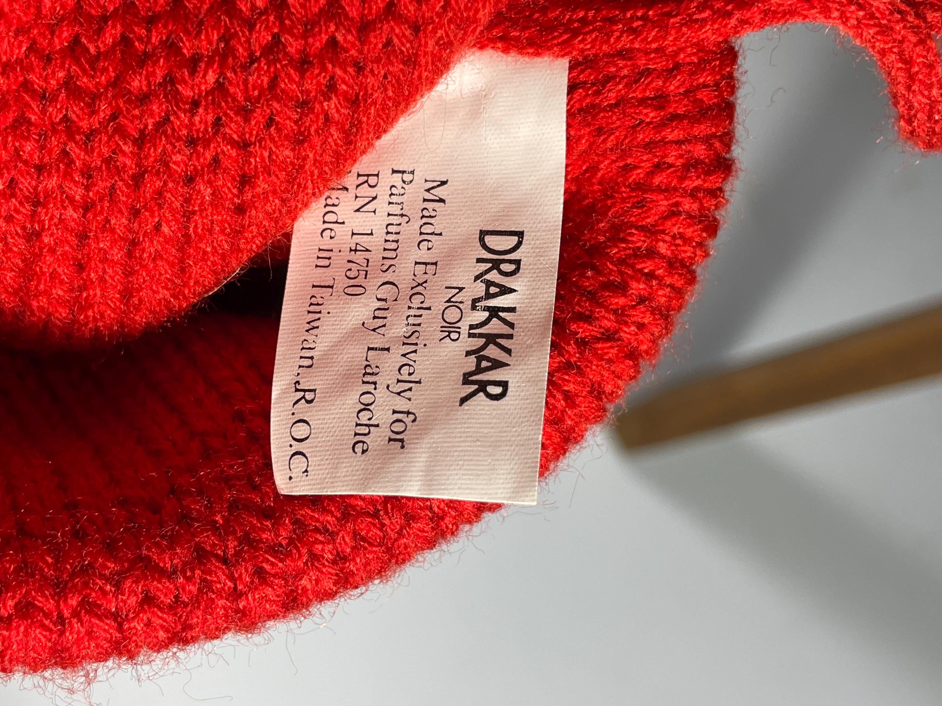 Drakkar Noir, striped, knit Christmas stocking. Promotional stocking from the 1990's cologne, Drakkar Noir. Red and black striped stocking with knit hook for easy hanging. Original tag inside.